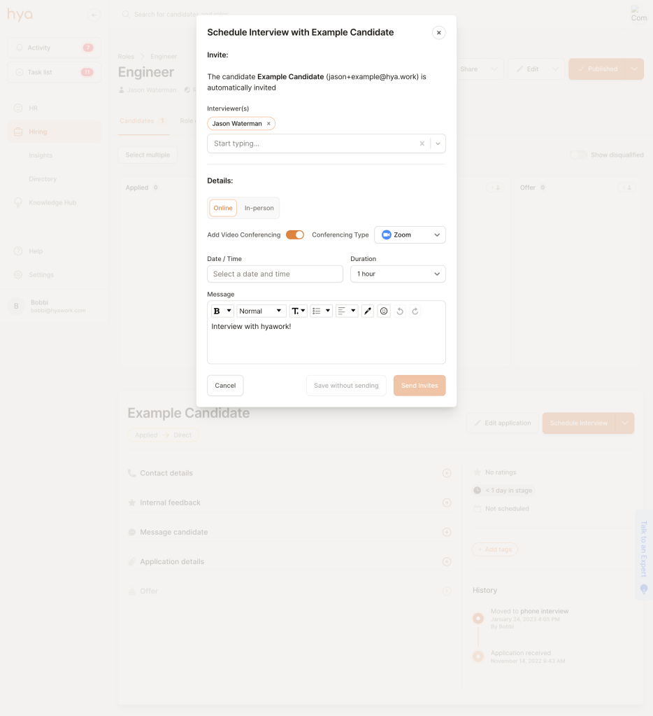 Another important iteration that came directly from user feedback was creating a calendar integration so that all interviews scheduled on hya automatically created events in popular calendar apps for both the candidate and interviewers.