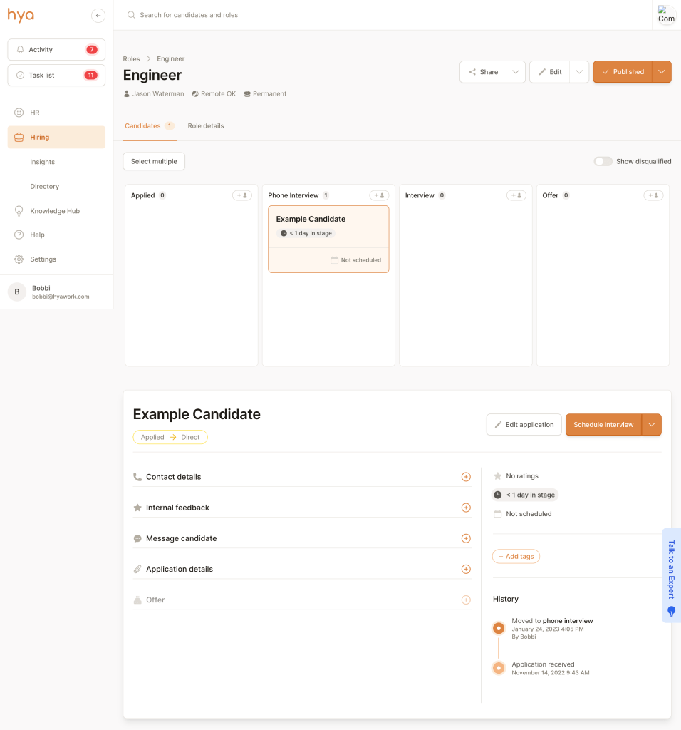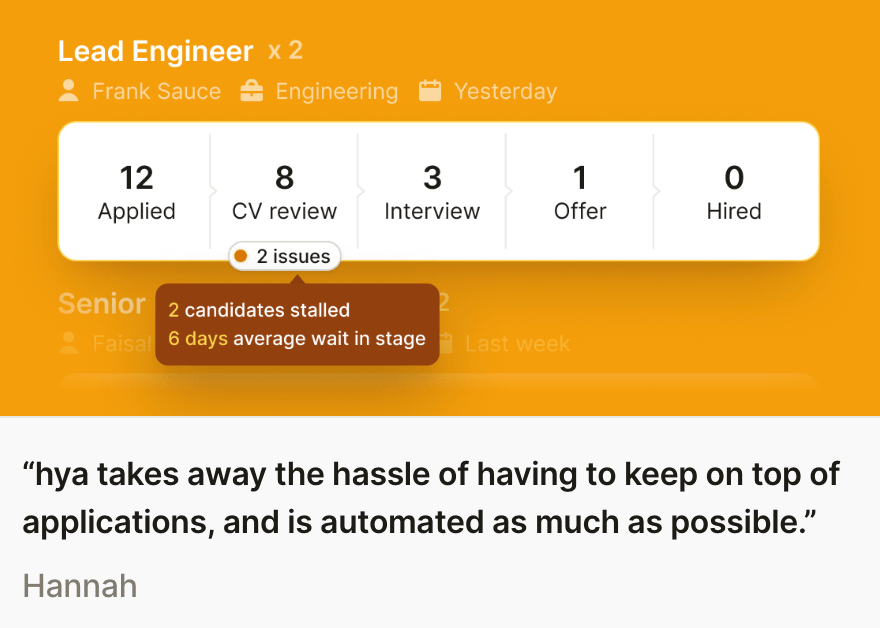 hya is an ATS (Applicant Tracking System) designed to help small businesses by building in the expert advice of our founders and their combined 40+ years in the industry.