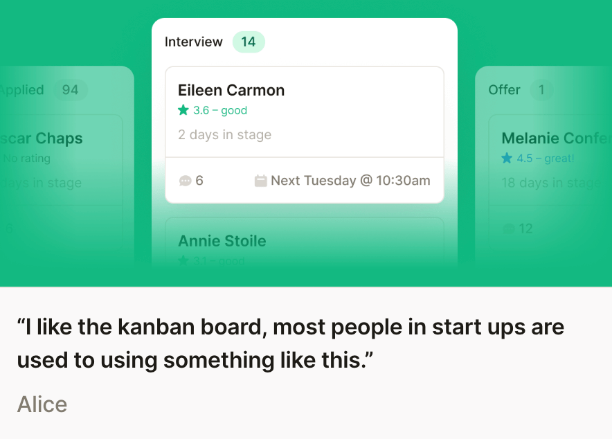 To help our Sergio persona users who specified a pain point around knowing how best to move a candidate through the process, we had the main CTA change to the next logical step for the candidate you have selected. For example, if the candidate has been moved to an interview stage but no interview has yet been scheduled the CTA will be ‘Schedule interview’. Once the interview has been scheduled the CTA becomes ‘Advance to [next stage]’. This was highlighted as a very useful feature during usability testing.